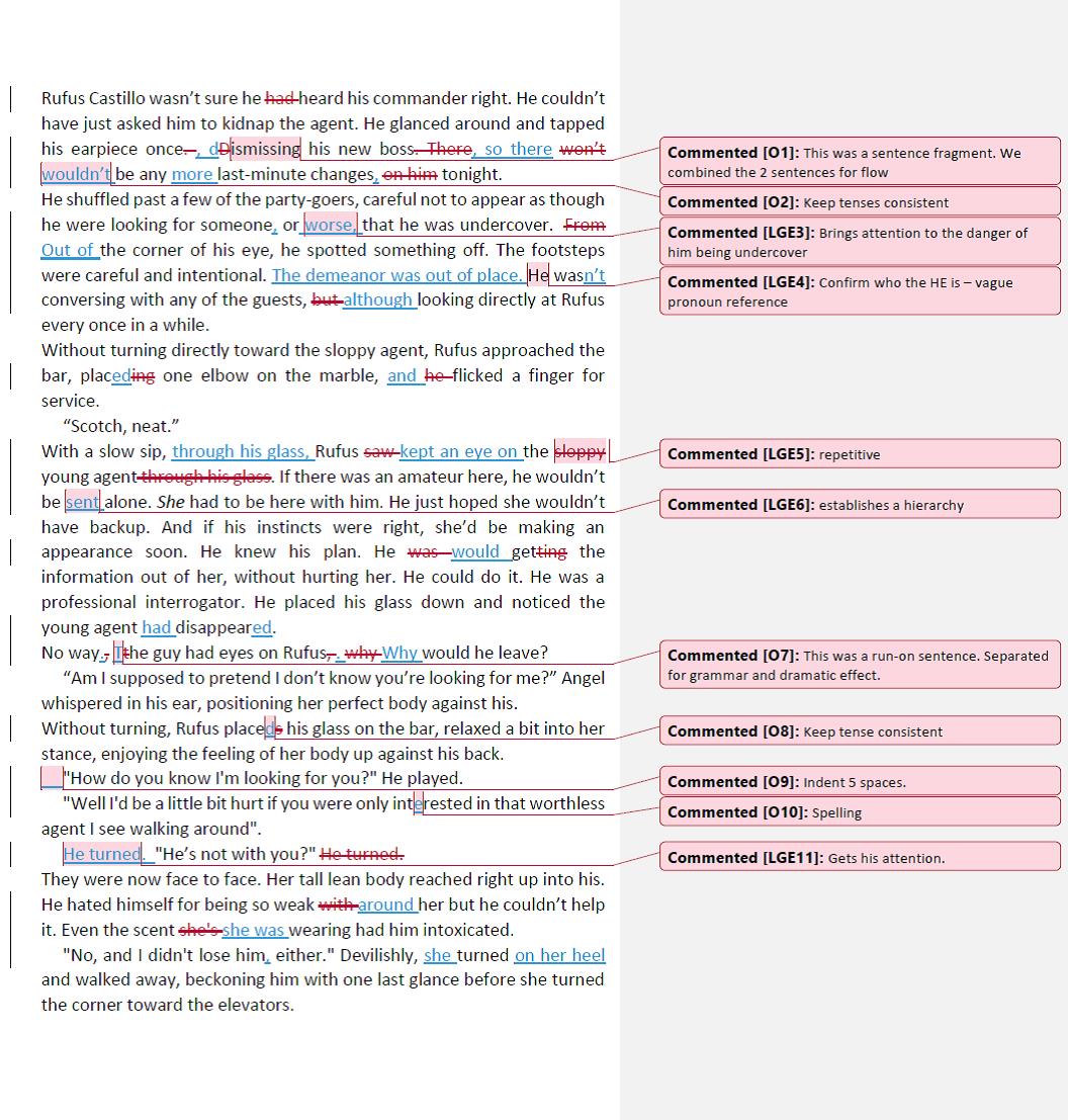 Every piece of literature should go through at least one round of line editing. A professional editor will review your manuscript and use Microsoft Word Track Changes, providing editing that corrects typos, punctuation, grammar, pacing, sentence structure, tense consistency, pov accuracy, and stronger wording where we see fit.